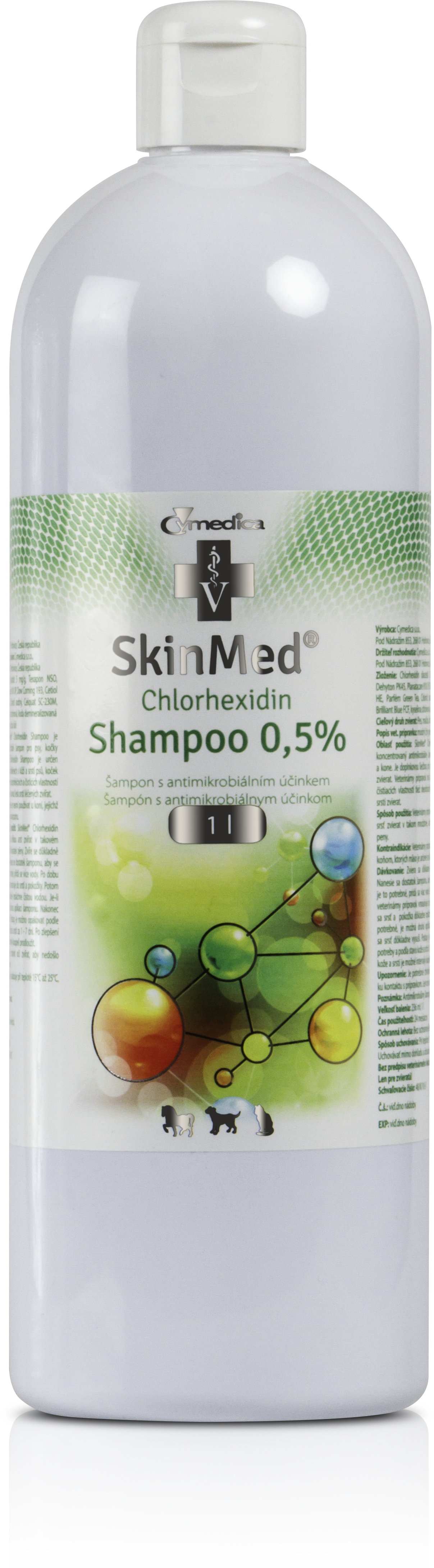 kože a srsti zvierat. Šampón má okrem dezinfekčných a čistiacich