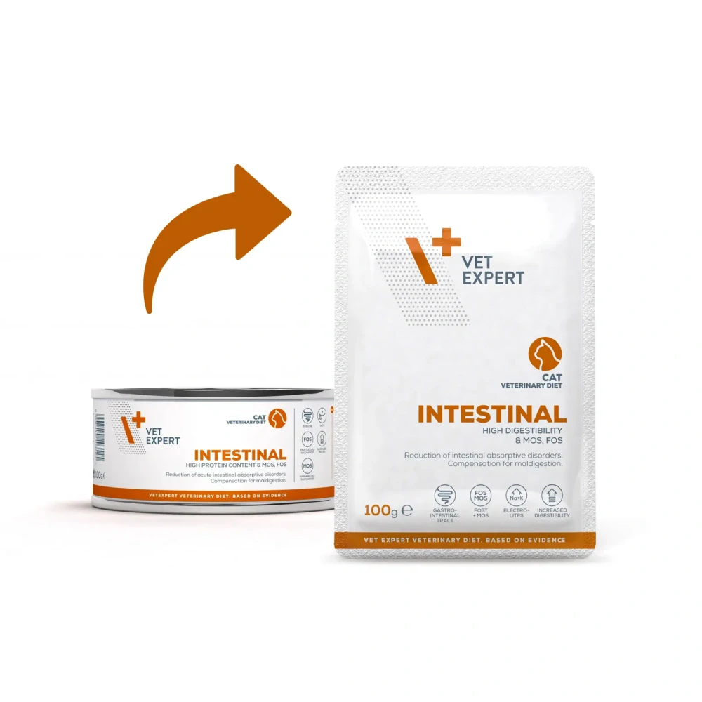 Kompletná a vyvážená dietetická strava, odporúčaná na použitie pri poruchách trávenia a vstrebávania av prípade chronickej pankreatickej nedostatočnosti. Dietetické krmivo Intestinal Cat sa vyznačuje vysokým obsahom ľahko stráviteľných bielkovín a vysokou stráviteľnosťou živín. Vďaka týmto vlastnostiam ho možno používať aj v období rekonvalescencie. Zvýšené hladiny sodíka a draslíka znižujú stratu týchto prvkov pri poruchách trávenia a črevnej absorpcie.